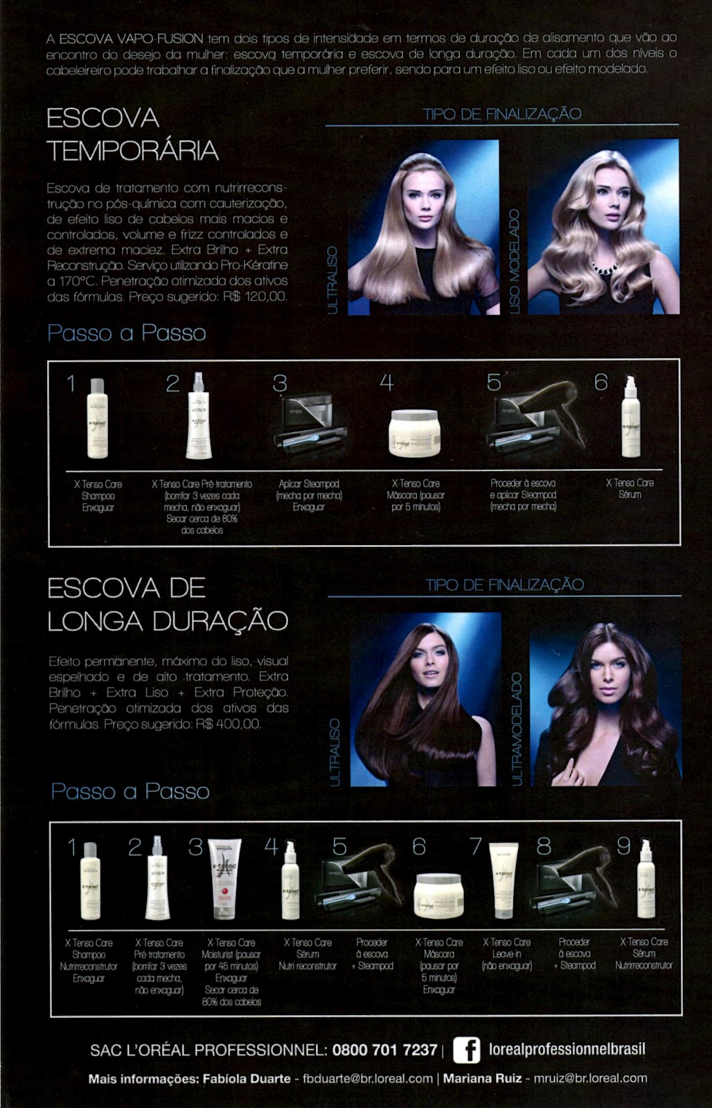 A Steampod possui um filtro para purificar a água que será transformada em vapor, através do vapor (que só é liberando quando a chapa está fechada), os fios receberam profundamente todos os benefícios que os produtos proporcionam. Esta nova chapa profissional é utilizada durante o processo de alisamento (e não é da maneira como utilizamos em casa), podendo-se obter um efeito de escova temporária ou de longa duração e com dois tipos de finalização: ultraliso ou liso modelado. O que irá diferenciar entre as duas escovas é a quantidade de passos e produtos da linha X-Tenso da L´Oreal Professionnel: na escova temporária são 6 passos (aplicação de 4 produtos) e na escova de longa duração são 9 passos (aplicação de 7 produtos).