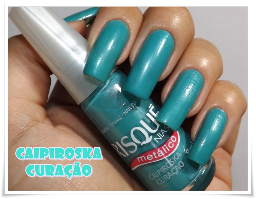 É um azul turquesa, com fundo puxadinho para o verde. A marca descreve ele como metálico. Boa cobertura com 1 camada. É minha cor preferida da coleção!