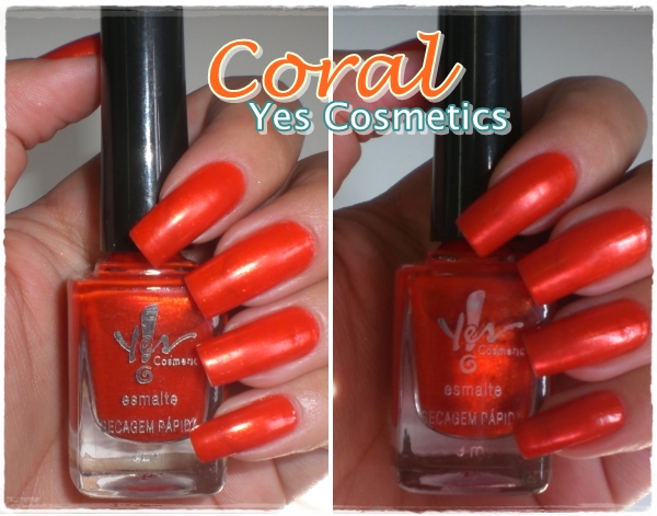 Eu gosto muito do tom e já tenho vários vidrinhos, o Coral da Yes é um tom de vermelho com fundo super alaranjado, tem micro partículas de brilho dourado. #xonei