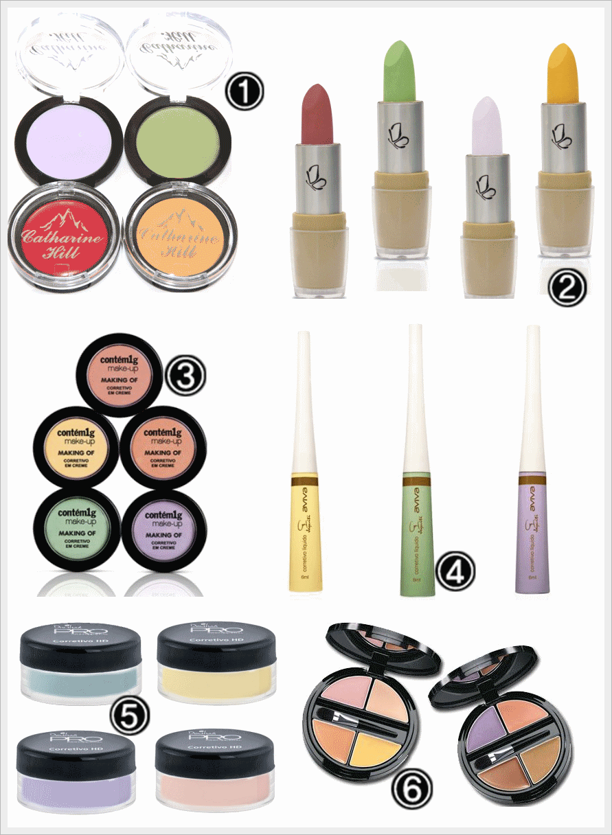 Lilás: Serve pra esconder manchas amareladas, alaranjadas e até meio amarronzadas, como sardas, queimaduras e manchas de sol ou espinhas em processo inflamatório.