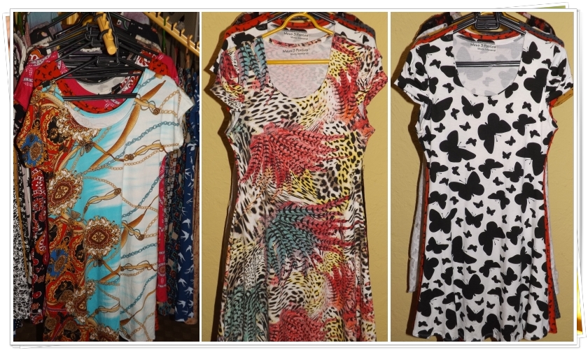 Entre as estampas estão as padronagens da moda e também os desenhos que representam a marca em pinturas manuais. As modelagens são simples e permitem ser usadas mais à vontade (soltinhas), ou mais acinturadas, com o cintinho que acompanha os vestidos, também feito à mão.