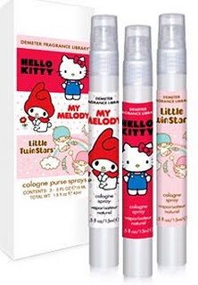 São três fragrâncias diferentes com embalagens meigas. Como a Hello Kitty adora maçã (sua comida preferida é a torta de maçã preparada pela mãe), seu perfume naturalmente traz uma mistura dos aromas de maçã verde, vermelha e amarela. O da coelhinha My Melody tem cheirinho de amêndoas e de baunilha, enquanto a fragrância que leva o nome dos gêmeos Kiki e Lala tem notas de diferentes frutas cítricas.