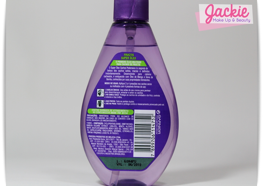 Super Óleo Multi-Uso Cachos Poderosos de Garnier Fructis – Multi-uso: desembaraça, amacia e solta, sela as pontas, protege da umidade e dá brilho. Princípios ativos: óleo de manga e seiva de bambu!