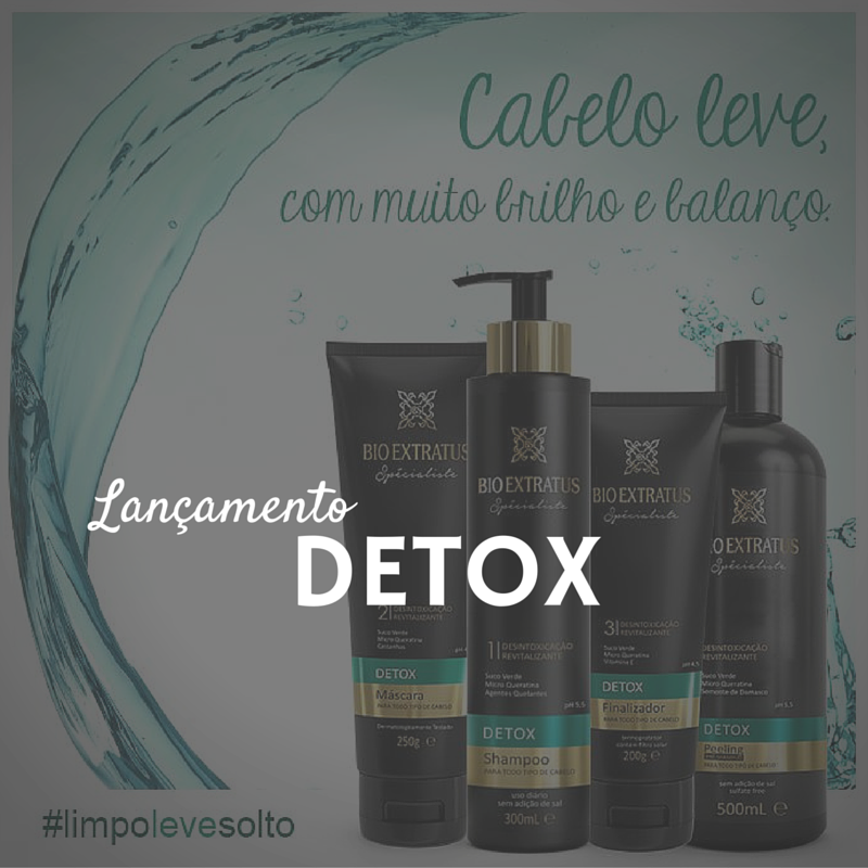 A linha Spécialiste Detox de Bio Extratus elimina as impurezas dos fios e do couro cabeludo, combate o envelhecimento capilar, equilibra os minerais e os nutrientes como protege contra os danos acumulativos, sem ressecá-los. O resultado são cabelos mais leves, saudáveis. com brilho e balanço. Sua fórmula é composta por: