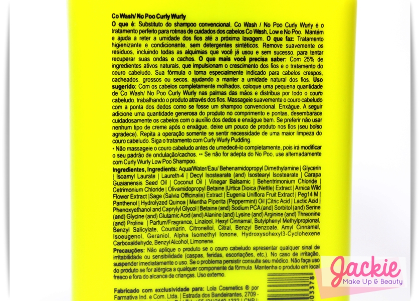 “Com os cabelos completamente molhados, coloque uma quantidade de Co-Wash/No Poo Curly Wurly nas palmas da mãos e distribua por todo o couro cabeludo, trabalhando o produto através dos fios. Massageio suavemente o couro cabeludo com a ponta dos dedos como se fosse um shampoo convencional. Enxágue. A seguir adicione uma quantidade generosa do produto no comprimento e pontas, desembarace cuidadosamente os cabelos com o auxílio dos dedos e enxágue bem. Se preferir não usar nenhum tipo de creme após o enxágue, deixe um pouco de produto nos fios (seu bolso agradece). Repita a operação somente se sentir necessidade de uma maior limpeza do couro cabeludo. Siga o tratamento com o Curly Wurly Pudding.* Não massageie o couro cabeludo antes de umedecê-lo completamente, pois irá modificar o seu padrão de ondulação/cachos.** Se não for adepta no No Poo, use alternadamente com o Curly Wurly Low Poo Shampoo.”