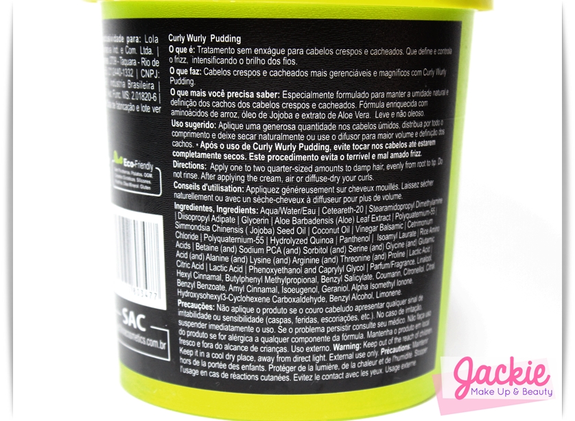A Curly Wurly Lola Cosmetics é composta por 3 produtos. Assim como na versão antiga, a nova linha contém como ativos chave o vinagre balsâmico (atua como regulador de ph selando as cutículas dos fios), o óleo de coco e os aminoácidos.