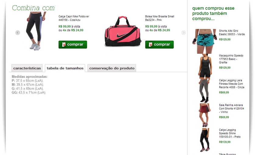 No caso das roupas o site tem uma tabela de tamanhos, para auxiliar na escolha além de ter um recurso bem bacana que mostra outros produtos similares sugeridos para o mesmo pedido. Por exemplo se você seleciona uma calça ele relaciona com um top, tênis, bolsa, meia e etc,