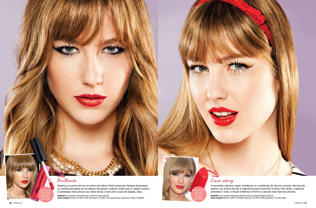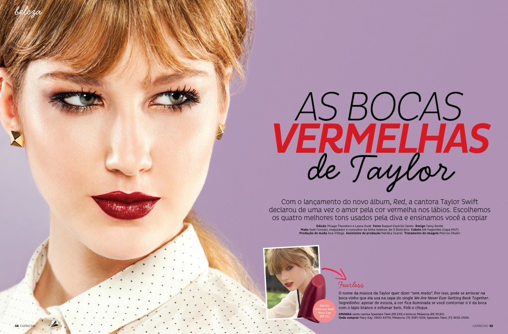 Atualizando minha leitura de blogs vi um editorial de beleza bem bacana no blog do fofo do Sadi Consati “As Bocas Vermelhas de Taylor” a make foi feita para a Revista Capricho, edição 1159.