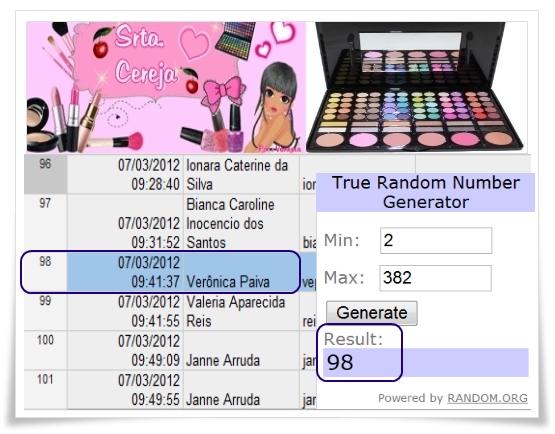 Novamente a ganhadora do sorteio da linda paleta não apareceu… Então vamos ao novo resultado espero que pela última vez…