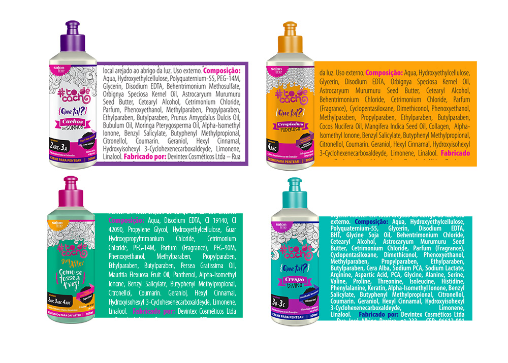 Linha #todecacho: A grande aposta no que diz respeito a cachos conta com 5 produtos. Os cremes para pentear com nomes engraçados como: Que tal? Cachos dos sonhos!, Que tal? Crespo Divino! E Que tal? Crespíssimo poderoso!